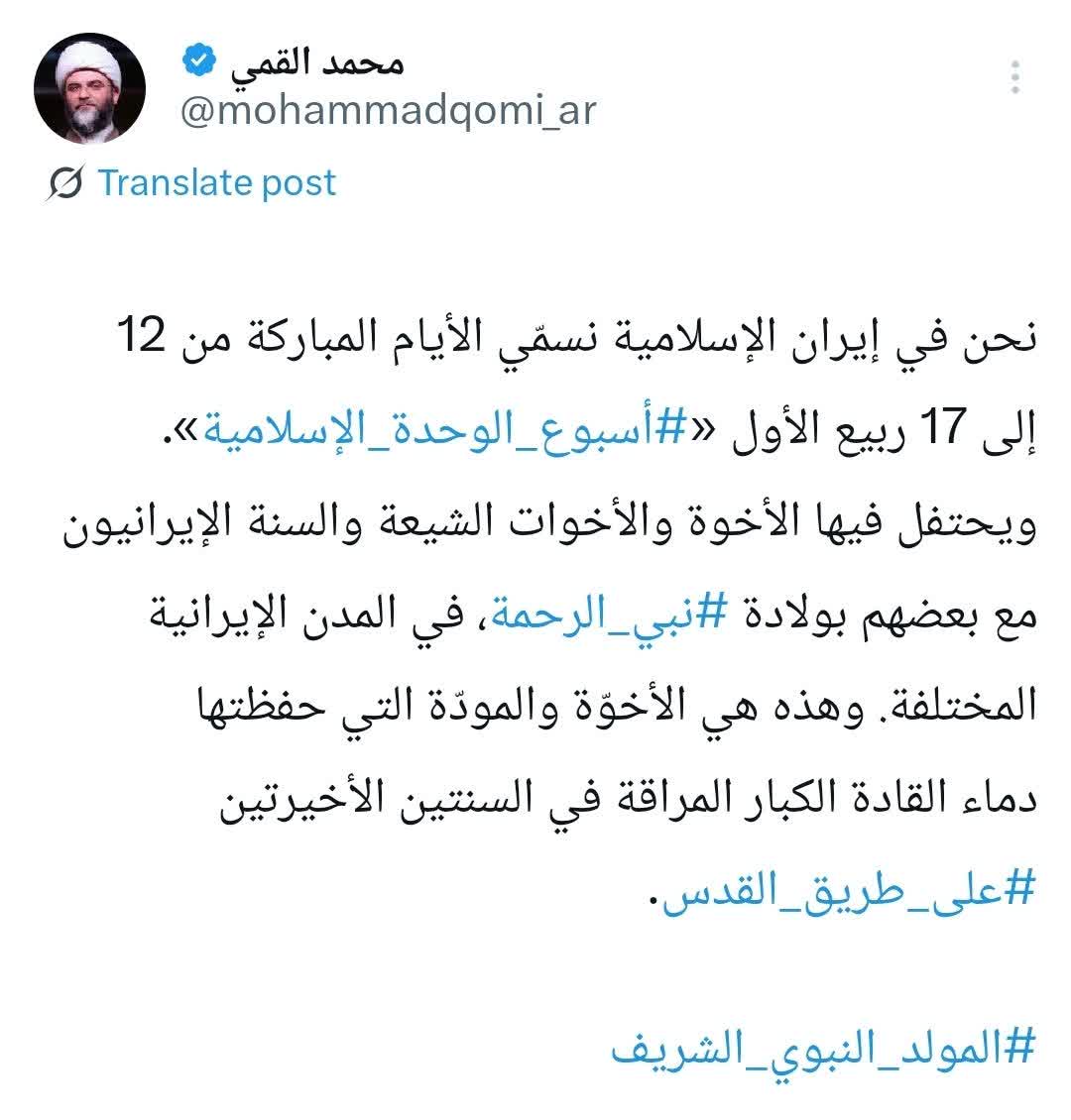 به گزارش روابط عمومی سازمان تبلیغات اسلامی، حجت‌الاسلام محمد قمی، رئیس سازمان تبلیغات اسلامی به مناسبت هفته وحدت در صفحه شخصی خود در شبکه اجتماعی ویراستی نوشت؛