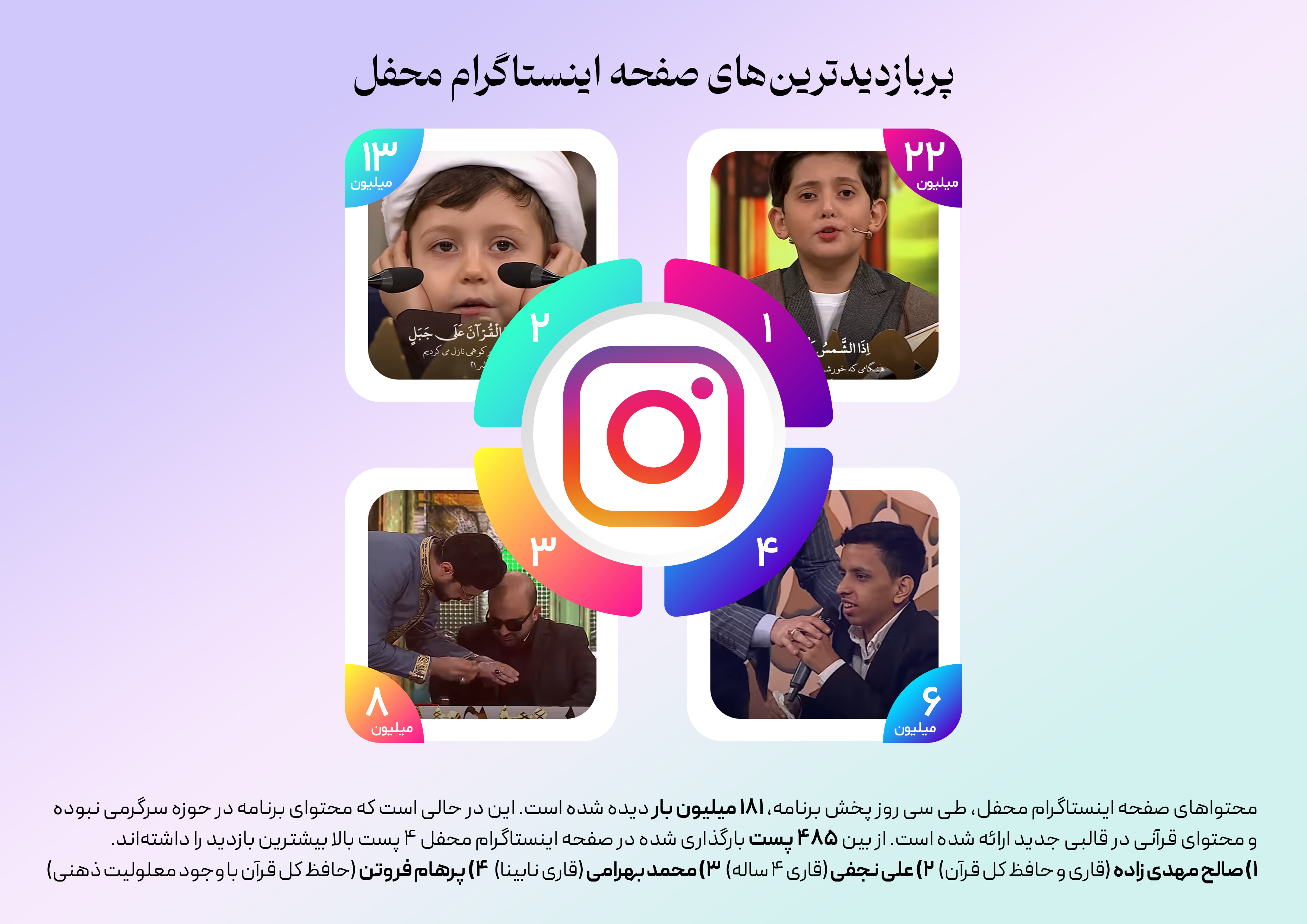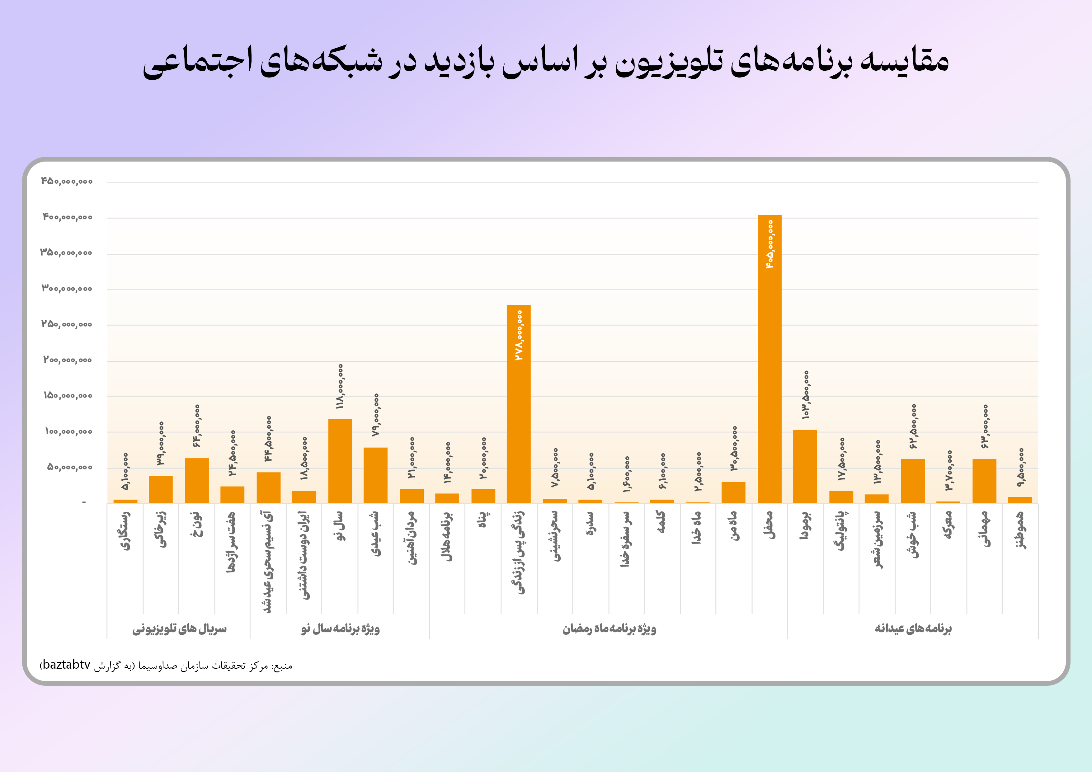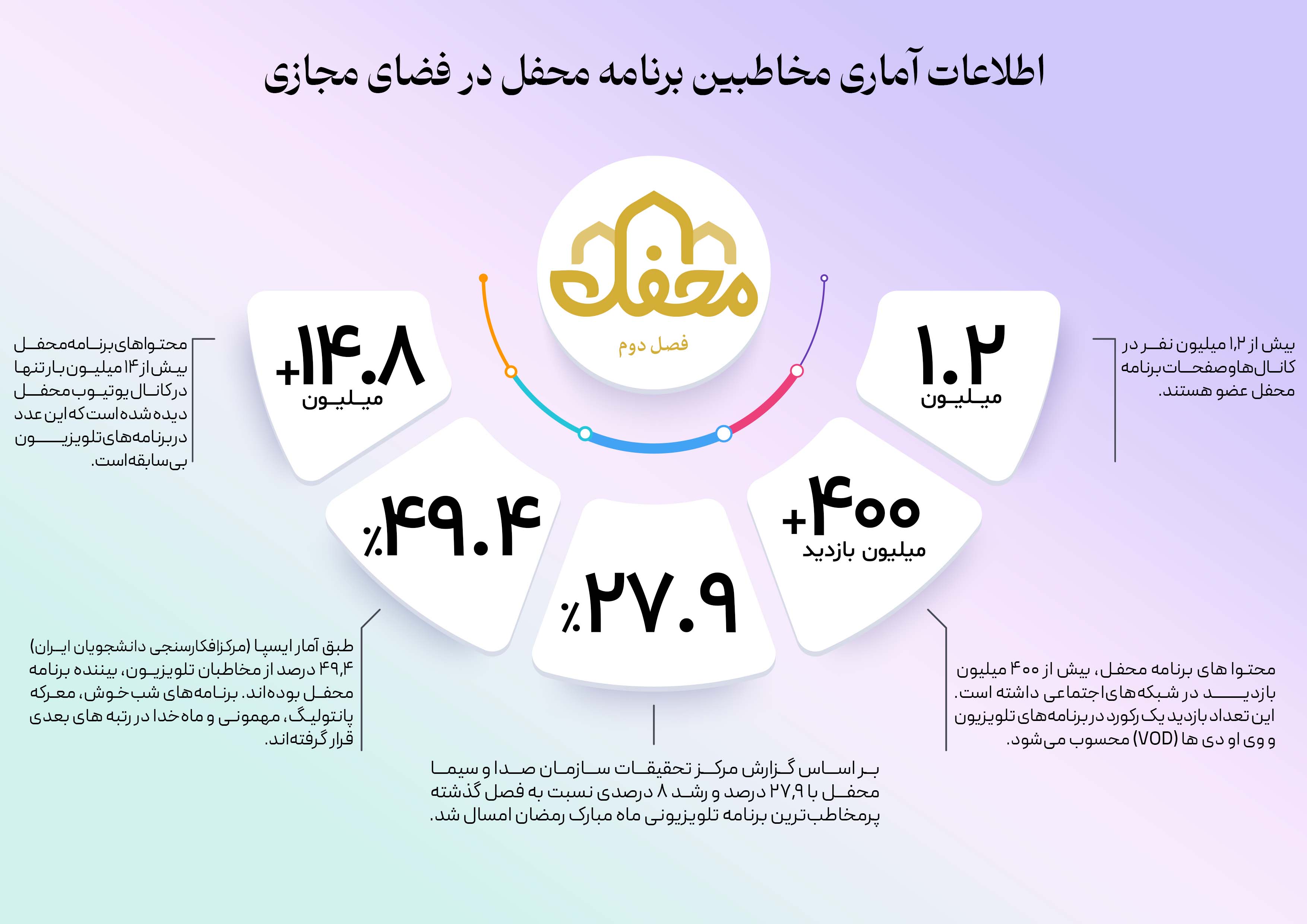 از ثبت بیش از ۴۰۰ میلیونبار بازدید در فضای مجازی تا ثبت بیش از سهمیلیون و صد هزار مشاهده و کسب رتبه اول بازدید در تلوبیون. در این اطلاع نگاشت نگاهی میکنیم بر آمار و ارقام مخاطبین محفل در فضای مجازی.