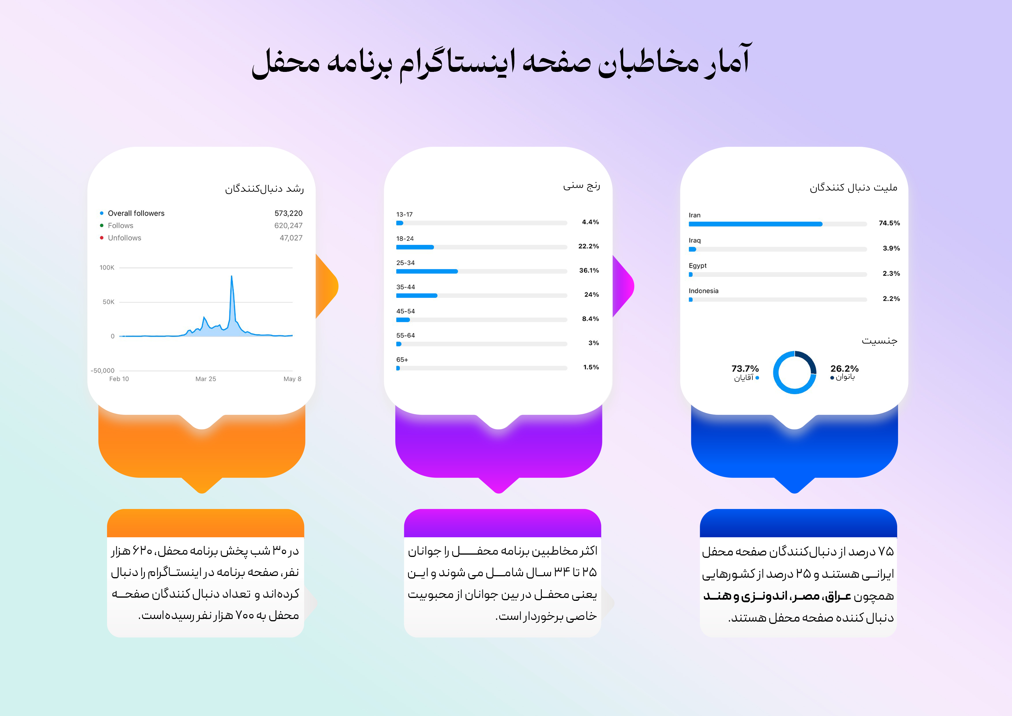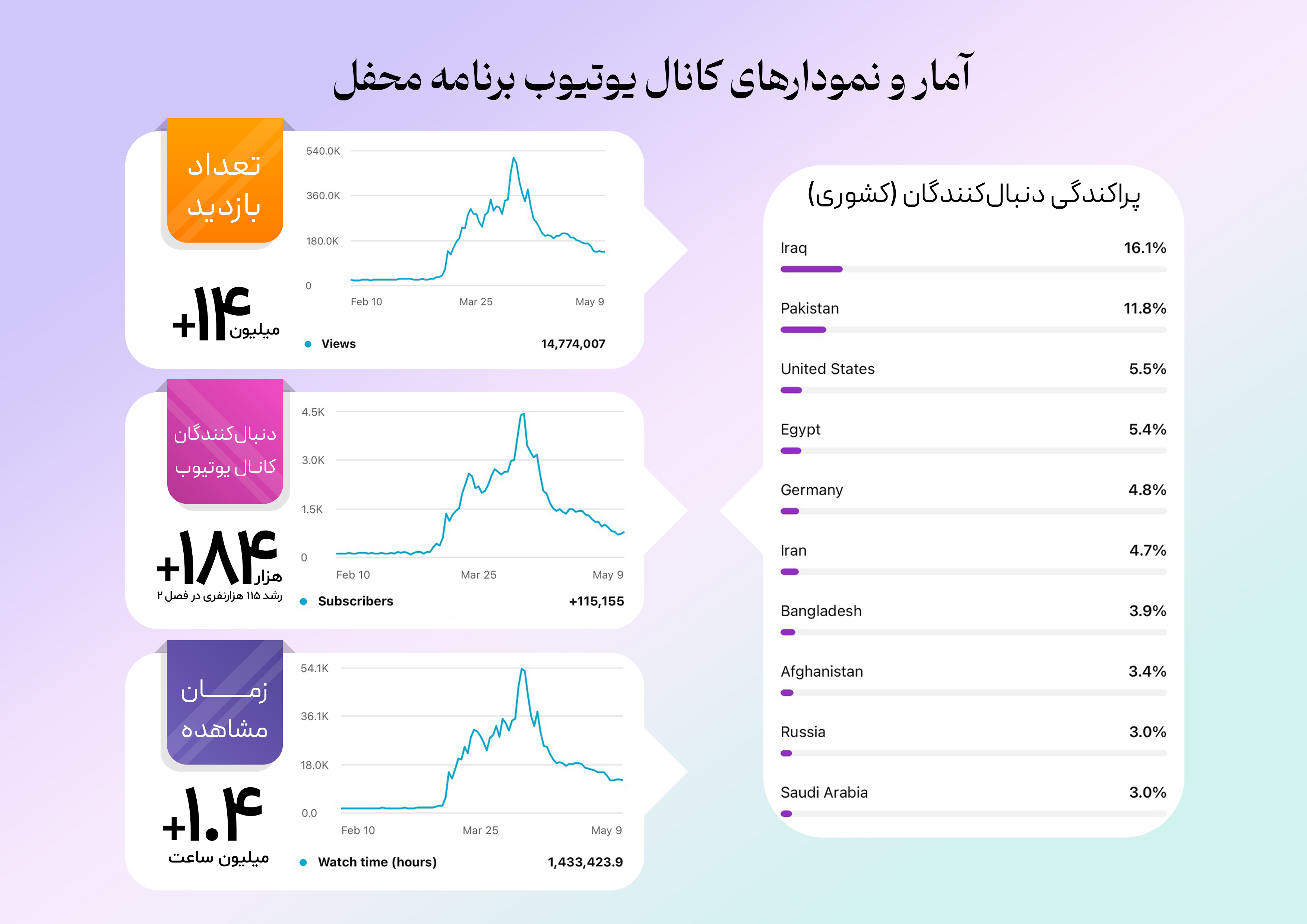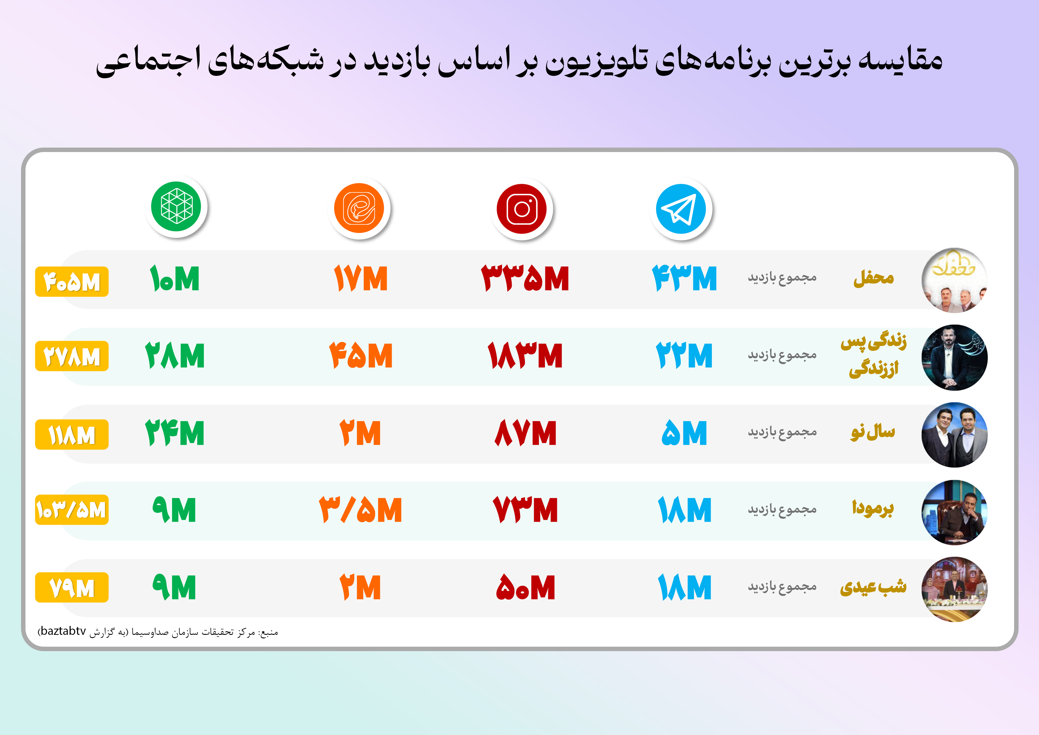 از ثبت بیش از ۴۰۰ میلیونبار بازدید در فضای مجازی تا ثبت بیش از سهمیلیون و صد هزار مشاهده و کسب رتبه اول بازدید در تلوبیون. در این اطلاع نگاشت نگاهی میکنیم بر آمار و ارقام مخاطبین محفل در فضای مجازی.
