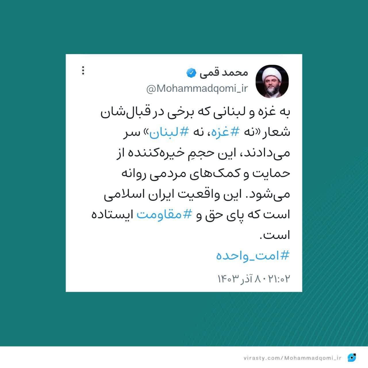 به گزارش روابط عمومی سازمان تبلیغات اسلامی، حجتالاسلام محمد قمی، رییس سازمان تبلیغات اسلامی در واکنش به میزان مشارکت مردم در پویش ایران همدل متنی را در شبکه اجتماعی ویراستی منتشر کرد.