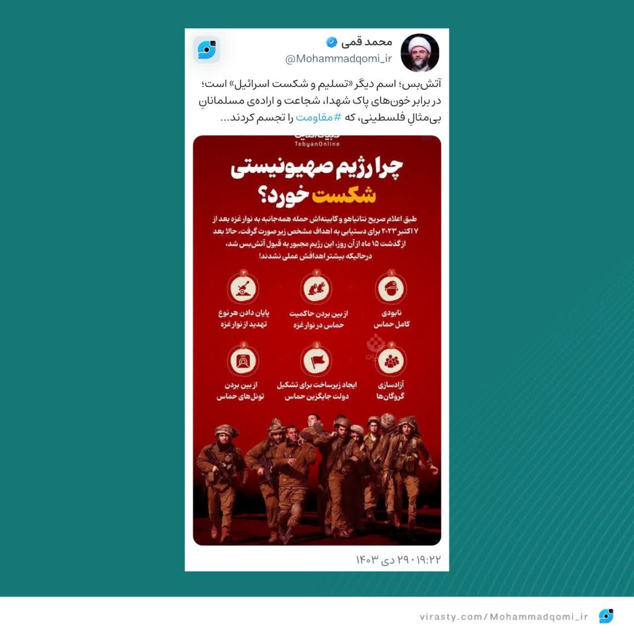 به گزارش روابط عمومی سازمان تبلیغات اسلامی، حجتالاسلام محمد قمی، رئیس سازمان تبلیغات اسلامی در پی انتشار خبر پذیرش آتشبس از طرف رژیم جعلی صهیونیستی با انتشار پستی در شبکه اجتماعی ویراستی و ارائه آمار و ارقامی از شکستهای این رژیم، آتشبس را شکست بزرگ نامید.
