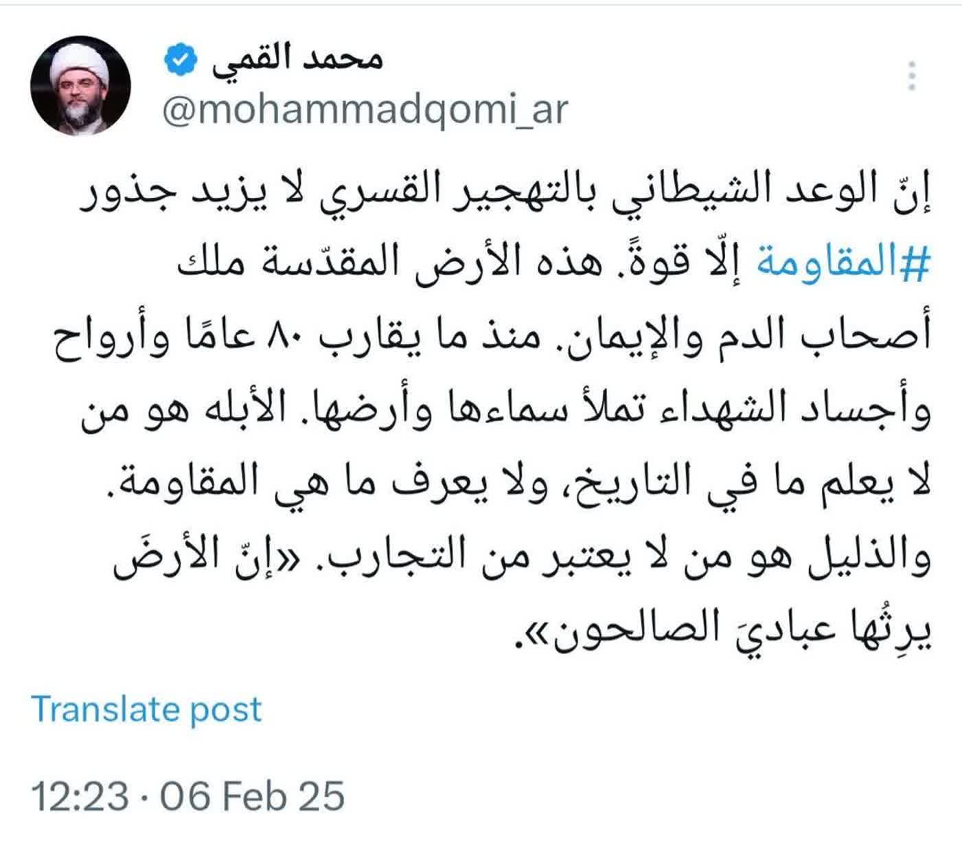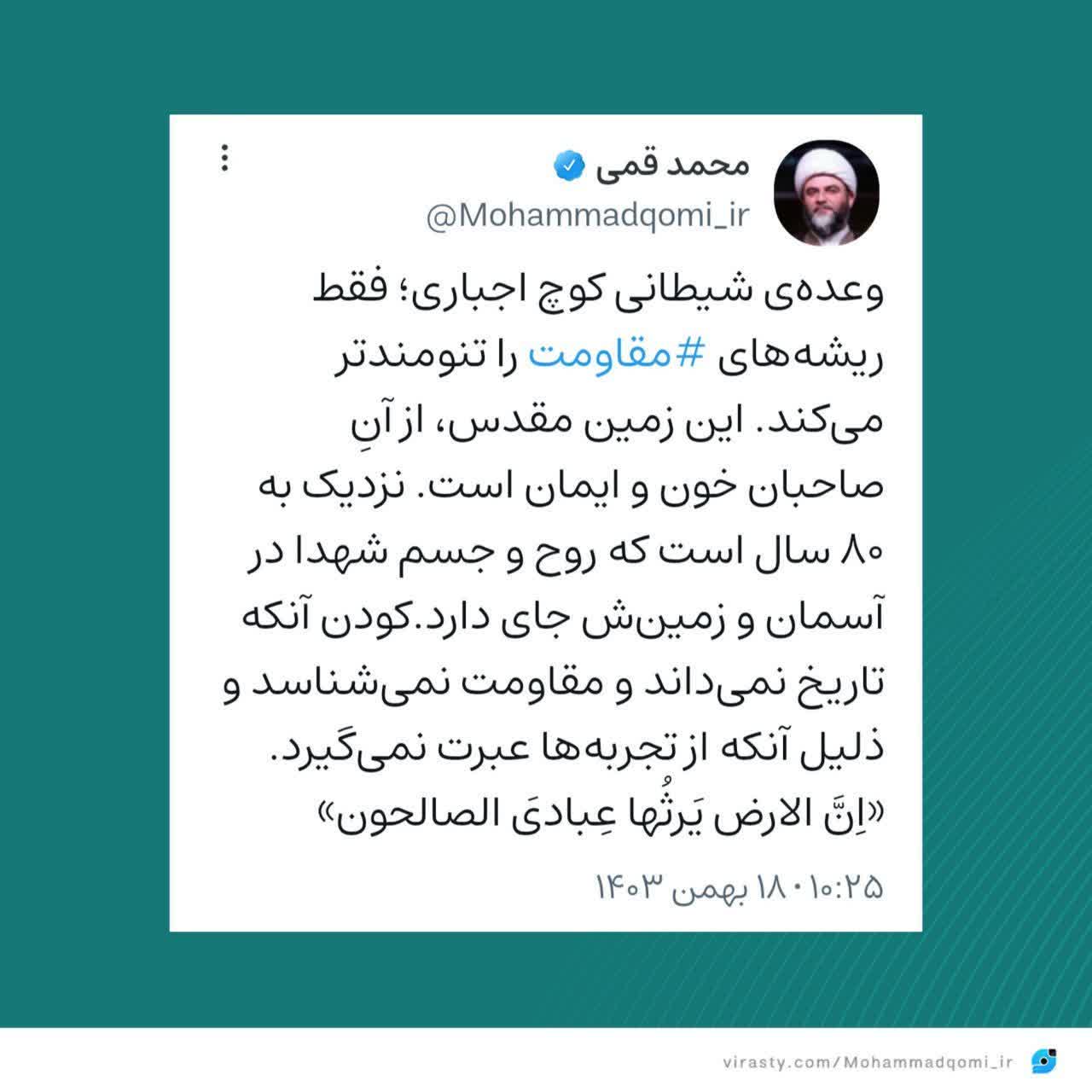 به گزارش روابط عمومی سازمان تبلیغات اسلامی، حجت الاسلام محمد قمی، رئیس سازمان تبلیغات اسلامی در واکنش به گزافهگویی قاتل آمریکایی در دیدارش با جنایتکار غاصب صهیونیستی، دربارهی سرنوشت سرزمین فلسطین و خانههای اهالی غزه با اشاره به آیاتی از قرآن متنی در شبکه اجتماعی ویراستی نوشت.