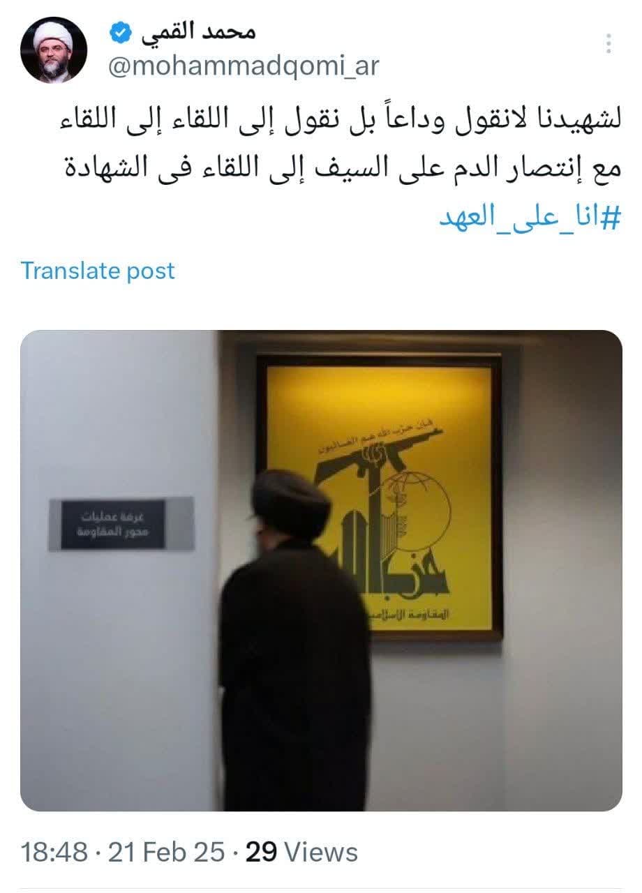 به گزارش روابط عمومی سازمان تبلیغات اسلامی، حجتالاسلام محمد قمی، رئیس سازمان تبلیغات اسلامی در آستانه برگزاری مراسم تدفین سید شهدا مقاومت قسمتی از سخنرانی حسن نصرالله در مراسم تشییع پیکر شهید فؤاد شکر را در صفحه شخصی خود در شبکه ایکس به زبان عربی منتشر کرد و نوشت؛