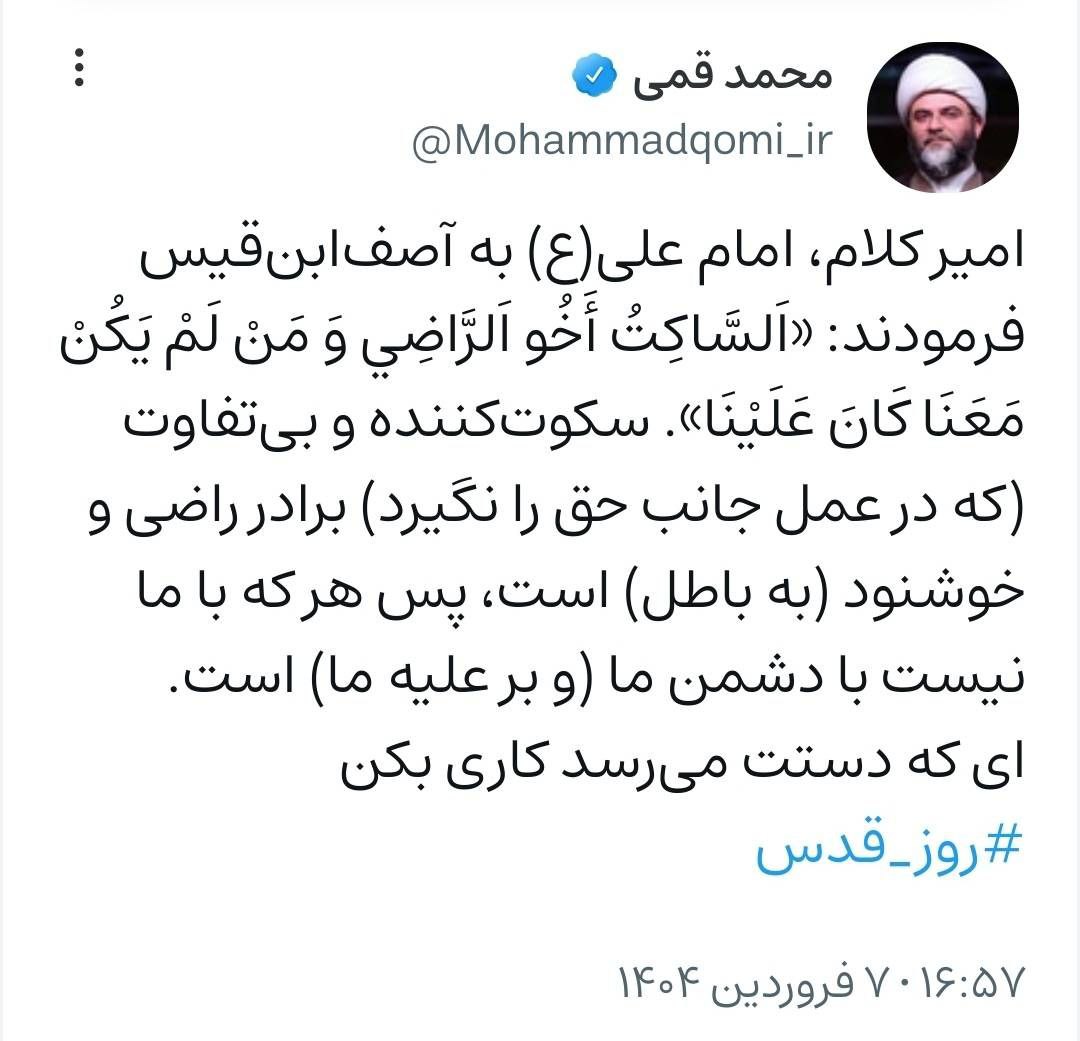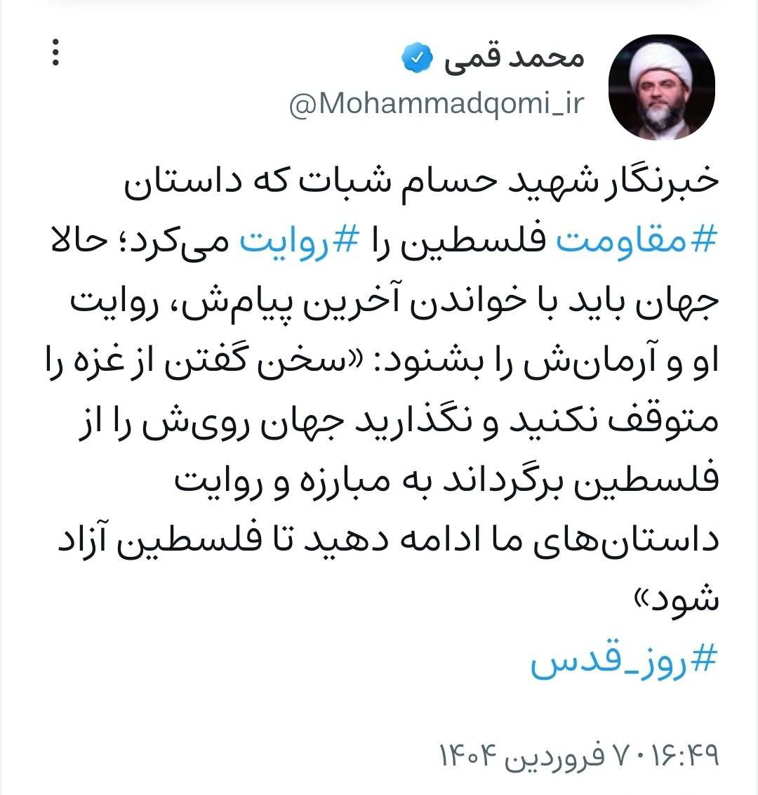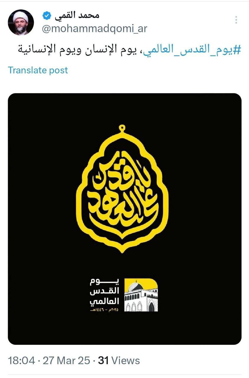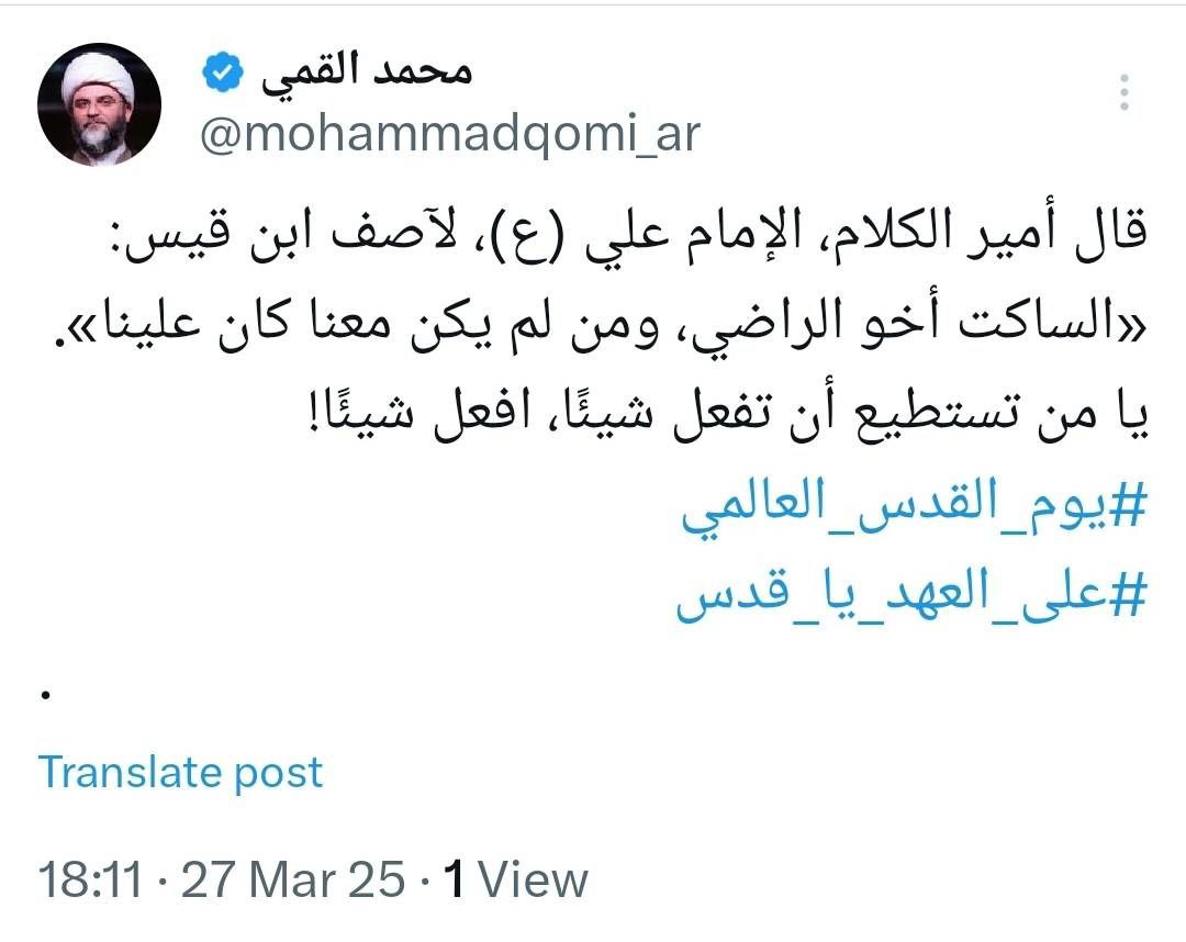 وی همچنین در شبکه اجتماعی ايکس به زبان عربی برای مخاطبین عرب زبان هم متنی منتشر کرد.حجتالاسلام قمی نوشت؛
