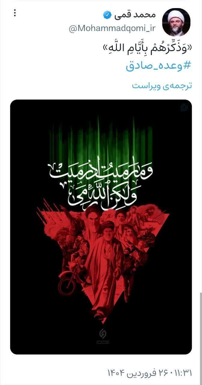 به گزارش روابط عمومی سازمان تبلیغات اسلامی، حجتالاسلام محمد قمی،رئیس سازمان تبلیغات اسلامی در واکنش به سالگرد عملیات وعده صادق یک در شبکه ویراستی با اشاره به آیه ۵ سورهی ابراهیم متنی منتشر کرد.