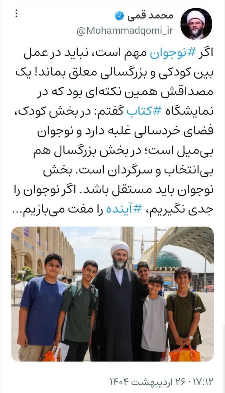 به گزارش روابط عمومی سازمان تبلیغات اسلامی، حجتالاسلام محمد قمی، رئیس سازمان تبلیغات اسلامی در صفحه شخصی خود در شبکه ویراستی دربارهی لزوم توجه ویژهتر به مخاطب نوجوان و برنامهریزی برای تفکیک بخشهای کودک و نوجوان در نمایشگاه کتاب نوشت؛