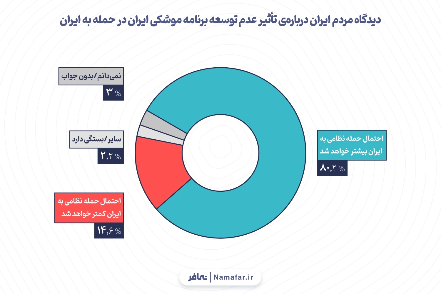 همواره نظرات و تحلیل‌های مختلفی درباره برنامه موشکی ایران و توسعه آن، در افکار عمومی و رسانه‌ها مطرح بوده است. برخی می‌گویند اگر ایران برنامه موشکی خود را توسعه ندهد، احتمال حمله نظامی به کشورمان بیشتر خواهد شد. زیرا که ایران در نگاه سایر کشورها ضعیف و بدون قدرت دفاعی تلقی می‌شود. در مقابل گروهی دیگر معتقدند که اگر ایران برنامه موشکی خود را توسعه ندهد، احتمال حمله نظامی کشورهای دیگر به ایران کمتر خواهد شد؛ زیرا در این صورت دیگر دلیلی برای ترس از ایران و حمله به آن وجود ندارد. واکاوی نظرات مردم در این‌باره نشان می‌دهد که 80.2درصد آن‌ها معتقدند که اگر ایران برنامه موشکی خود را توسعه ندهد، احتمال حمله نظامی به کشورمان بیشتر شده و موافق توسعه برنامه موشکی ایران هستند. این در حالی است که در سوی مقابل، 14.6درصد پاسخگویان، می‌گویند عدم توسعه برنامه موشکی ایران احتمال حمله به کشورمان را کم می‌کند. این همراهی 80درصدی در پیش از جنگ 12 روزه، حدود 70درصد بوده است؛ علت اصلی تغییر جدی و افزایش نزدیک به اشباع در رابطه با امنیت ساز بودن توان موشکی ایران، مشخصاً خود جنگ تحمیلی 12 روزه و کارایی موشک‌های ایرانی در پاسخگویی به حملات دشمن است. همچنین سرنوشت کشورهای همسایه مانند سوریه، حتی پس از توافق با آمریکا و حملات اسرائیل در روزهای اخیر به خاک سوریه و ناتوانی آن‌ها در پاسخ و دفاع از خود نیز می‌تواند باعث افزایش حمایت از برنامه موشکی در آینده نیز شود.