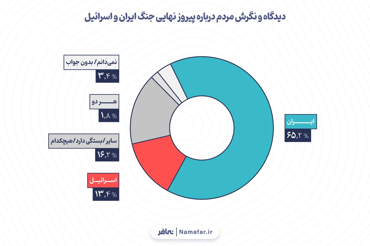 پس از پایان هر جنگ، اولین پرسشی که برای مردم و جامعه پیش می‌آید، نتیجه جنگ و پیروز و بازنده آن است. هرچند که تحول ماهیت جنگ‌ها و نحوه مقابله نظامی کشورها با یکدیگر، تعیین قطعی بازنده و پیروز جنگ را دشوار کرده است، اما یکی از معیارها و شاخص‌های مهم این امر، احساس پیروزی و شکست توسط افکار عمومی کشورهای درگیر در جنگ است. در همین راستا، از پاسخگویان پرسیده شده «به نظر شما پیروز نهایی جنگ اخیر ایران و اسرائیل، در مجموع ایران بوده است یا اسرائیل؟». یافته‌ها نشان می‌دهد که  65.2درصد از مردم ایران را پیروز جنگ اخیر می‌دانند، این در حالی است که در مقابل فقط 13.4درصد معتقد به پیروزی اسرائیل هستند، که این مؤلفه مهمی در برآیند نتیجه جنگ تا بدین جای کار در ذهن مردم است.