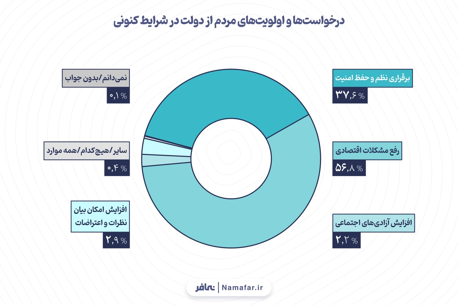 شناسایی و بررسی اولویت‌ها و درخواست‌های مردم و جامعه از دولت یکی دیگر از سؤالاتی بوده که از پاسخگویان سؤال شده است. رفع مشکلات اقتصادی مثل بیکاری، تورم و مسکن با 56.8درصد، همچنان اولویت و درخواست اصلی مردم از دولت بوده است. با این حال، برقراری نظم و حفظ امنیت در تمام شهرها و مرزهای کشور، نیز با 37.6درصد، جایگاه ویژه‌ای در درخواست‌های مردم پیدا کرده است.